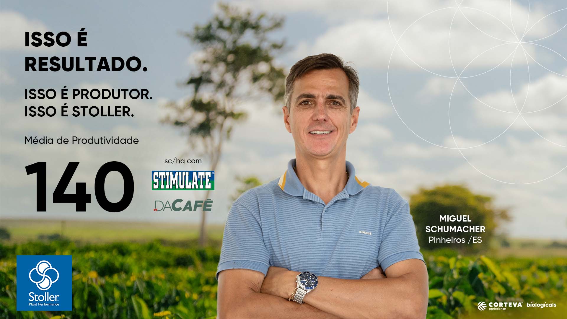 Miguel Schumacher faz parte do Grupo Schumacher Agrícola, uma empresa familiar localizada em Pinheiros (ES), na Fazenda Mega Sena. Há 6 anos, o grupo utiliza os produtos Stoller, buscando continuamente ampliar o potencial produtivo das lavouras. Antes da parceria, as médias de produtividade do café giravam em torno de 80 a 90 sc/ha. Com a adoção de um manejo mais estratégico e o suporte técnico da Stoller, os resultados evoluíram para uma média de 140 sc/ha, um avanço que reflete o compromisso da família com a excelência na produção.