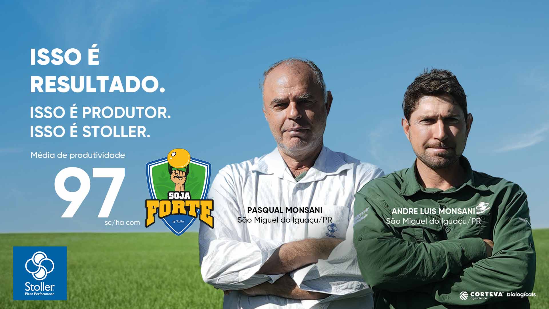 Pasqual Monsani e André Luiz Monsani produtores de São Miguel do Iguaçu/PR, compartilham suas experiências com o manejo da soja utilizando as soluções Stoller. Eles ressaltam que, há 10 anos, mantêm uma parceria com a Stoller, baseada em um relacionamento próximo com a equipe técnica e em soluções estratégicas para a cultura. Com o Soja Forte eles tiveram o RESULTADO de uma área com 97 sc/ha na soja, sendo um recorde de produção na propriedade.